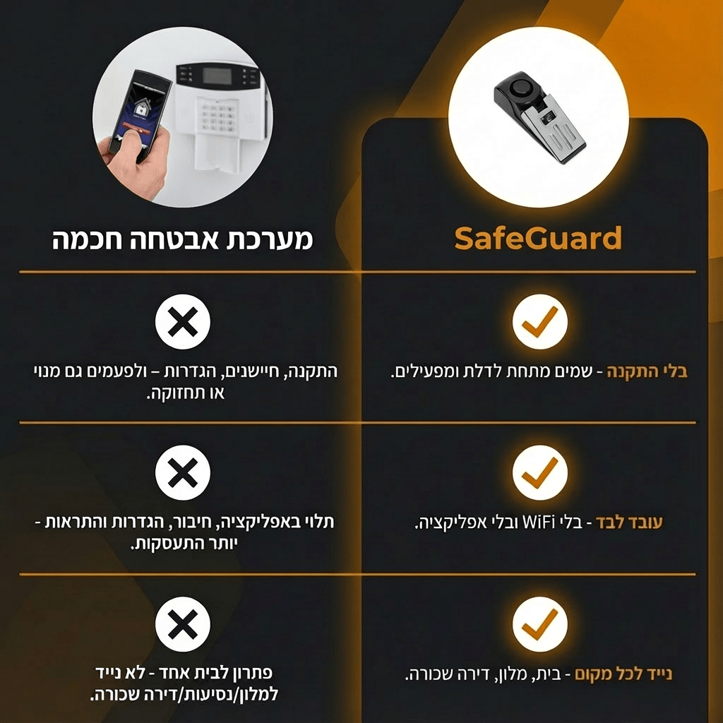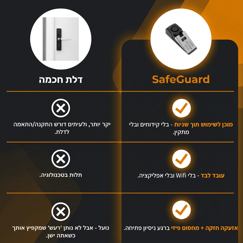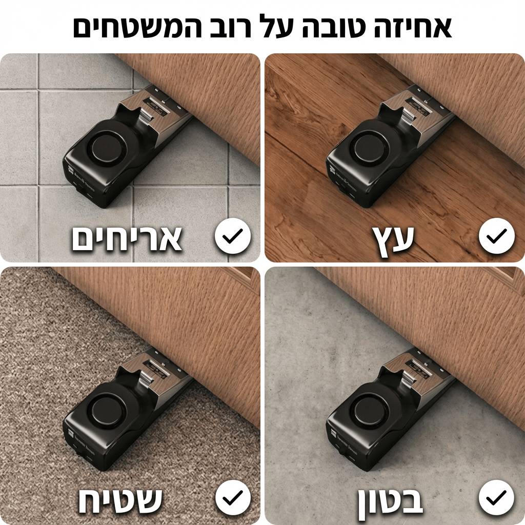 SafeGuard מתאים לדלתות שנפתחות פנימה ושיש להן מרווח(לא חייב גדול) מתחת לדלת. אם הדלת נפתחת החוצה, או צמודה לגמרי לרצפה בלי מרווח בכלל, ייתכן שזה לא יתאים.
